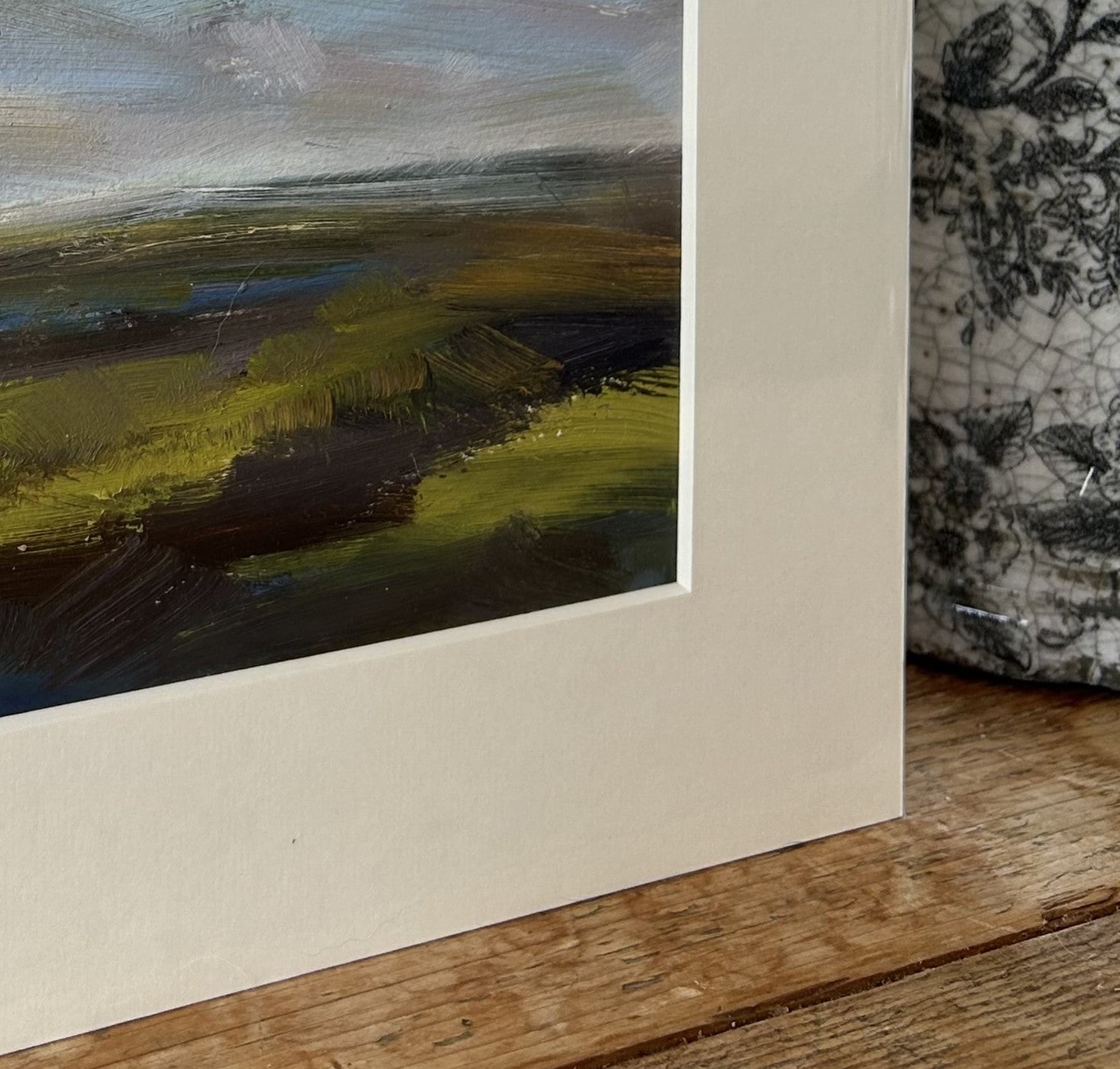 These are professionally mounted and wrapped by my local framer, in a warm white mount. These are shipped unframed. I recommend works on paper are framed under glass, ideally glass with a UV filter. Due to the possibility of glass breaking in transit, I prefer to send these pieces unframed. Images of these pieces in frames are provided to show you how these may look – you can of course choose any frame you like for these when you receive them. These pieces are signed on the back of the artwork (underneath the mount).
